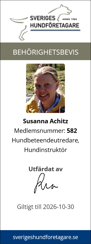 Företaget drivs av mig, Susanna Achitz, som är Dipl. Hundinstruktör, Dipl. Hundbeteendeutredare och Dipl. Hundbeteendevetare. Jag är även medlem i branschorganisationen Sveriges Hundföretagare. Därmed är min kompetens och yrkesexpertis kvalitetskontrollerad.